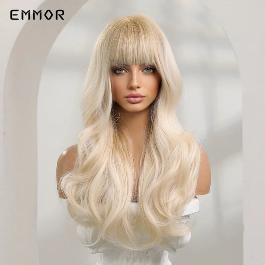Emmor Synthetic Ombre Blonde Platinum Wigs Long Wavy Wig for Women with Bangs Party Daily Heat Resistant Fibre Hair Wigs