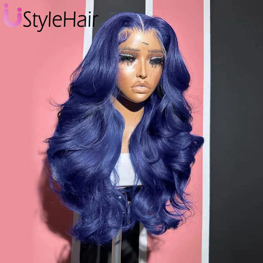 Body Wave Navy Blue 13x4 Lace Front Human Hair Brazilian Color Blue HD Transparent Lace Front Wig For Women Pre Plucked