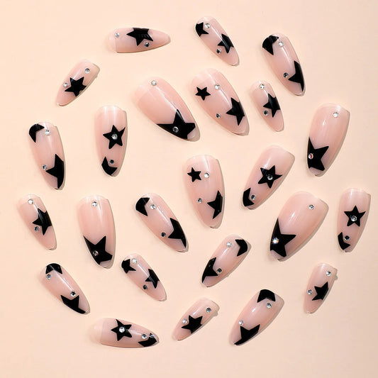 Ins y2k Fake Nails Almond Head Black Pentacle Star False Nail Patch Girl Women Wearable Full Cover Artificial Nail Patch 24pcs