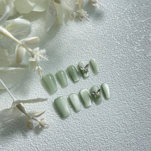 Short Green Handmade Cat Eye Press on Nails Glitter Wearable Coffin False Nails Full Cover Decoration Manicure Fake Nails Tips