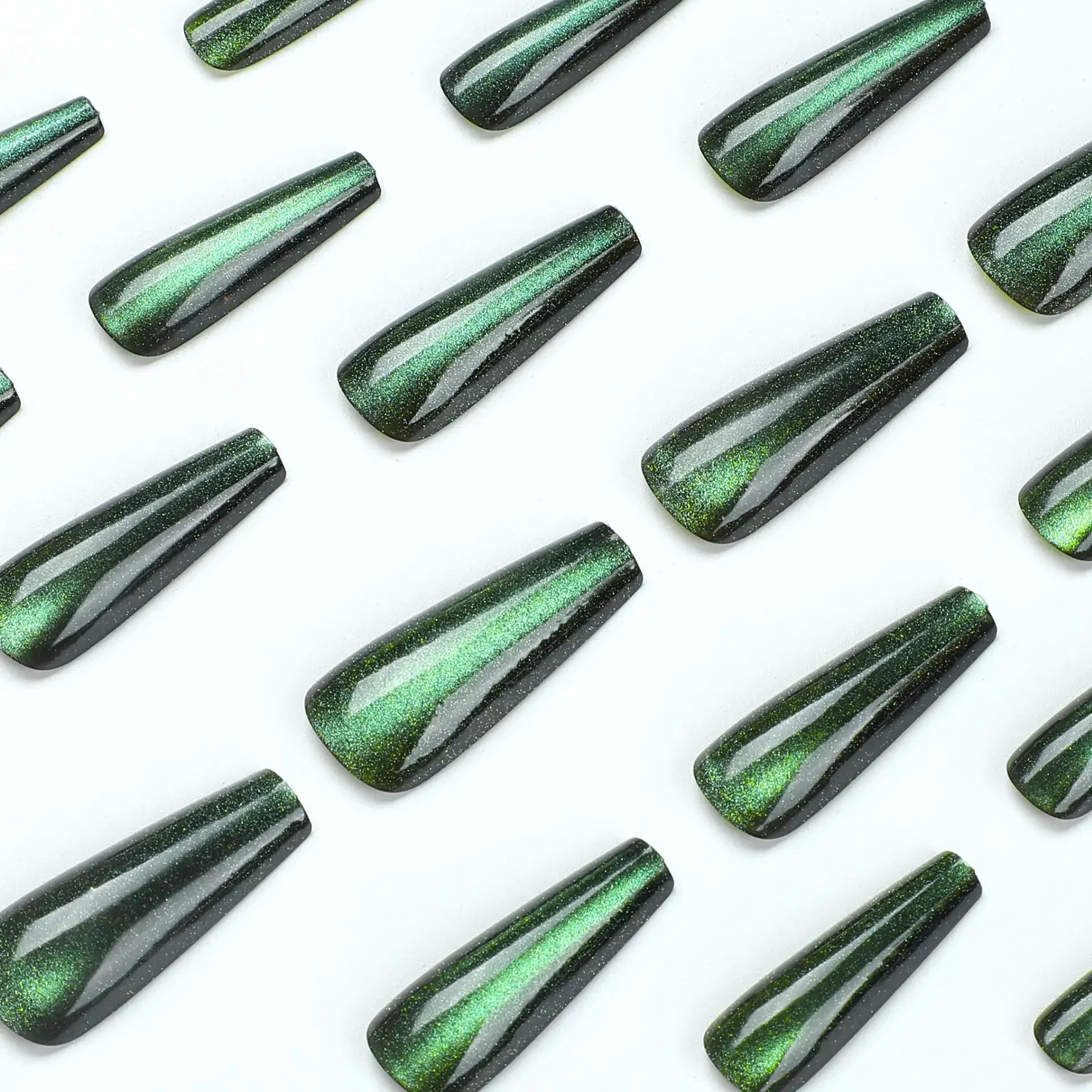 Glitter Fashion Green Cat Eye Wearable Long Ballet Fake Nails Detachable Full Cover Finished False Nails Press on Nail with Glue