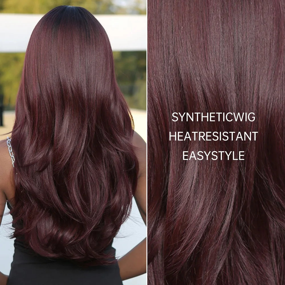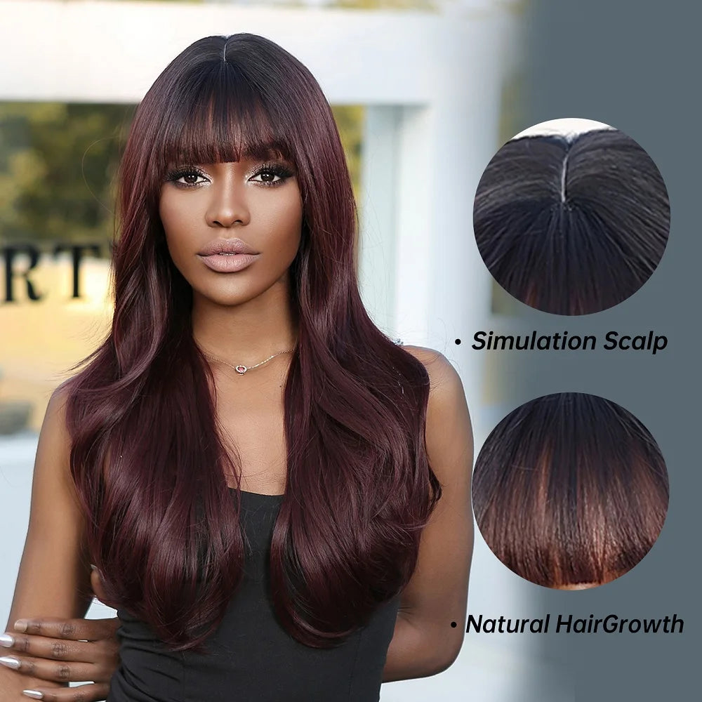 Long Dark Ombre Wine Red Brown Synthetic Wigs with Bangs Natural Wavy Hairs Wig for Women Daily Cosplay Party Heat Resistant Use